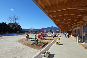 サマリー:筑波山のすそ野に広がる茨城県石岡市柿岡地区に建築されたこの保育所は、廊下を |
