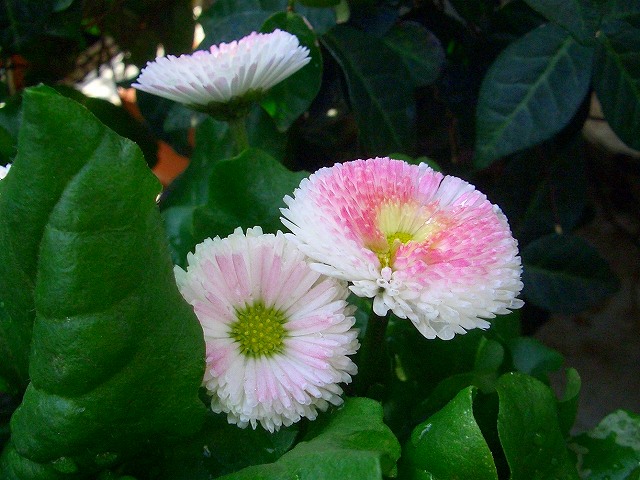 サマリー:一番上のベコニアも黄色のユリオプスデージー、ナデシコも3年ものです。 |